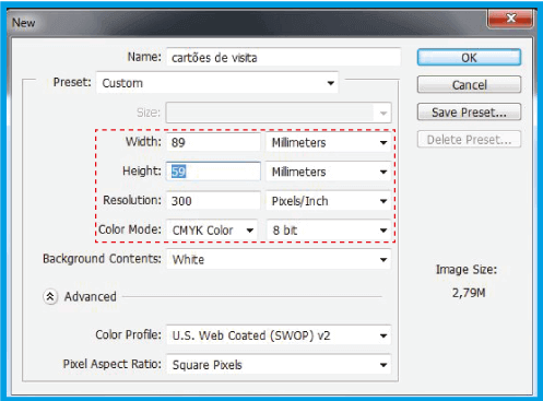 .É importante que coloque de resolução para garantir a qualidade das imagens, bem como selecionar o sistema de cores para evitar cores inesperadas no ato da impressão.