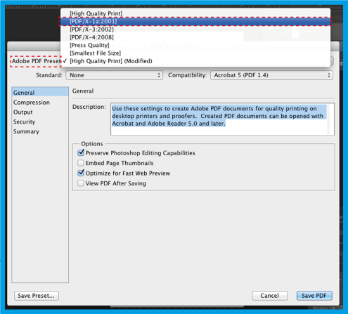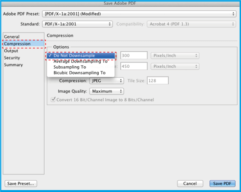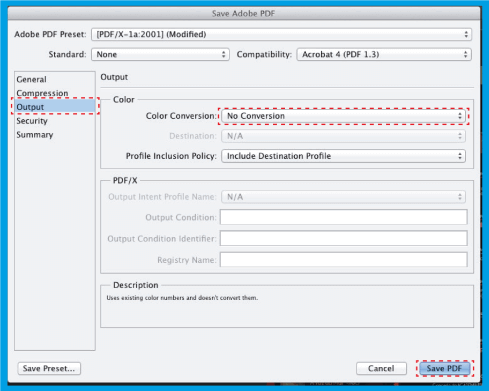 .Em seguida selecione e do lado direito em selecione a . Esta opção garante que grave o seu ficheiro sem perfis de cor. Abaixo, clique em Save Preset… , salve estas predefinições de PDF com o nome que desejar, para poder reutilizá-la sempre. Clique em .